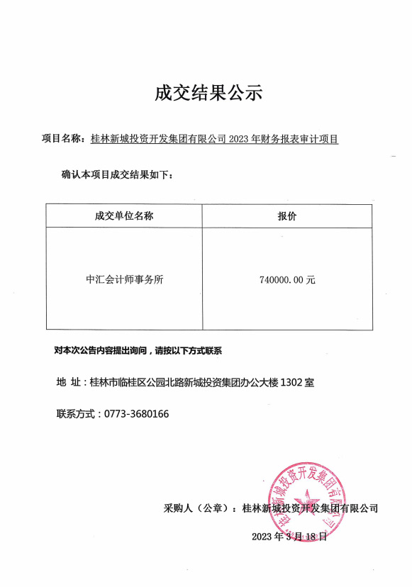 桂林新城投資開發(fā)集團有限公司2023年財務(wù)報表審計項目成交結(jié)果公示