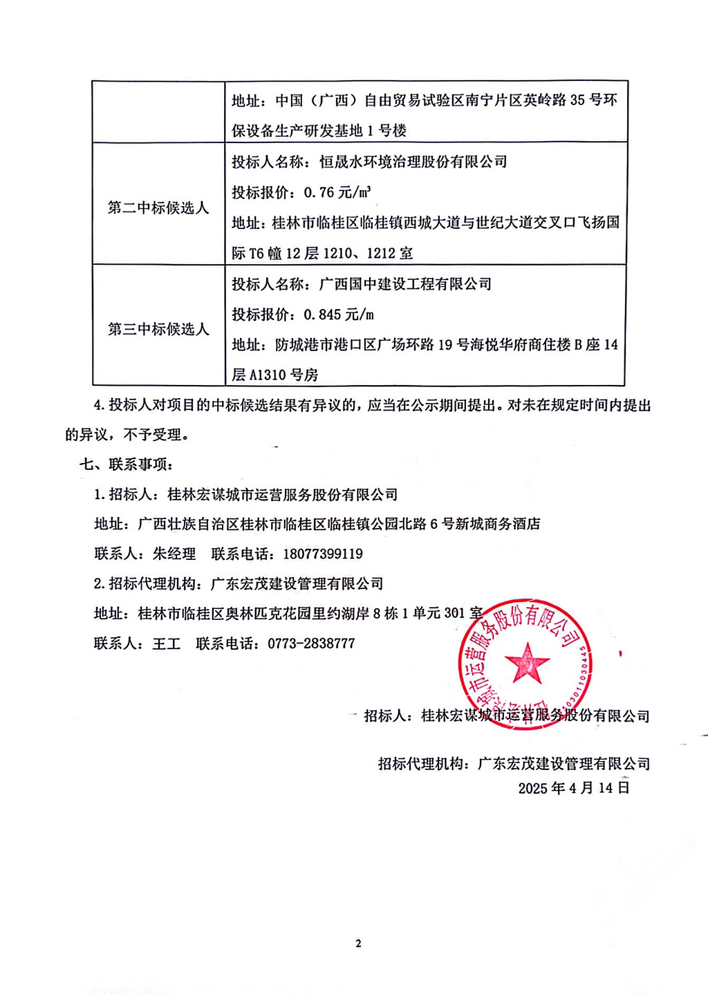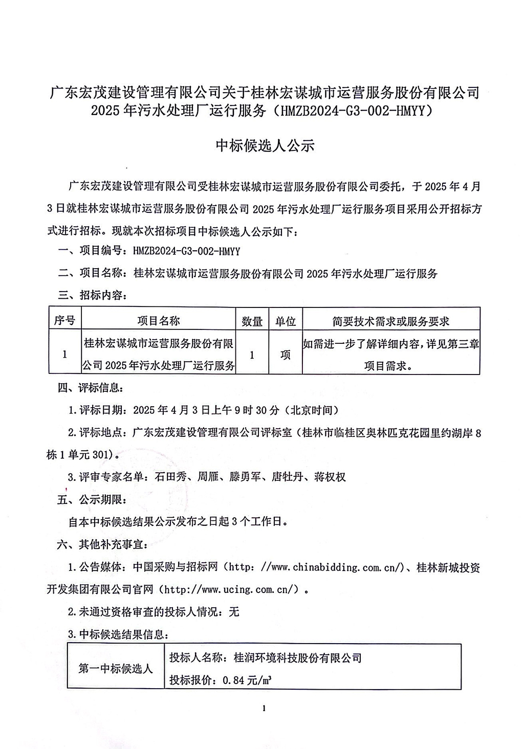 廣東宏茂建設(shè)管理有限公司關(guān)于桂林宏謀城市運營服務股份有限公司2025年污水處理廠運行服務(HMZB2024-G3-002-HMYY)中標候選人公示