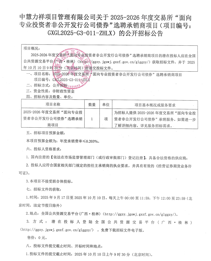 中慧力祥項目管理有限公司關(guān)于2025-2026年度交易所“面向?qū)I(yè)投資者非公開發(fā)行公司債券”選聘承銷商項目(項目編號:GXGL2025-G3-011-ZHLX)的公開招標公告