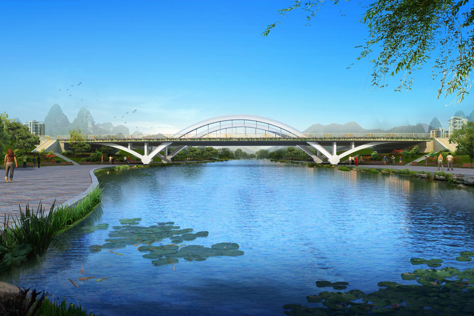 萬平橋位于萬平路與西城大道交叉口西側(cè),橫跨中心環(huán)形河水域,是目前臨桂新區(qū)所有橋梁當(dāng)中,投資最大、結(jié)構(gòu)最復(fù)雜、施工難度最大的一座橋梁。橋梁設(shè)計為中承式飛燕拱橋,采用Y構(gòu)鋼管混凝土拱橋組合體系,外觀新穎獨(dú)特,顏色鮮明亮麗,橋長123m,橋面寬度60m,全橋分左右兩幅,每幅橋在人行道及中央分隔帶處各設(shè)置拱肋,共設(shè)4道拱肋、28根吊桿。